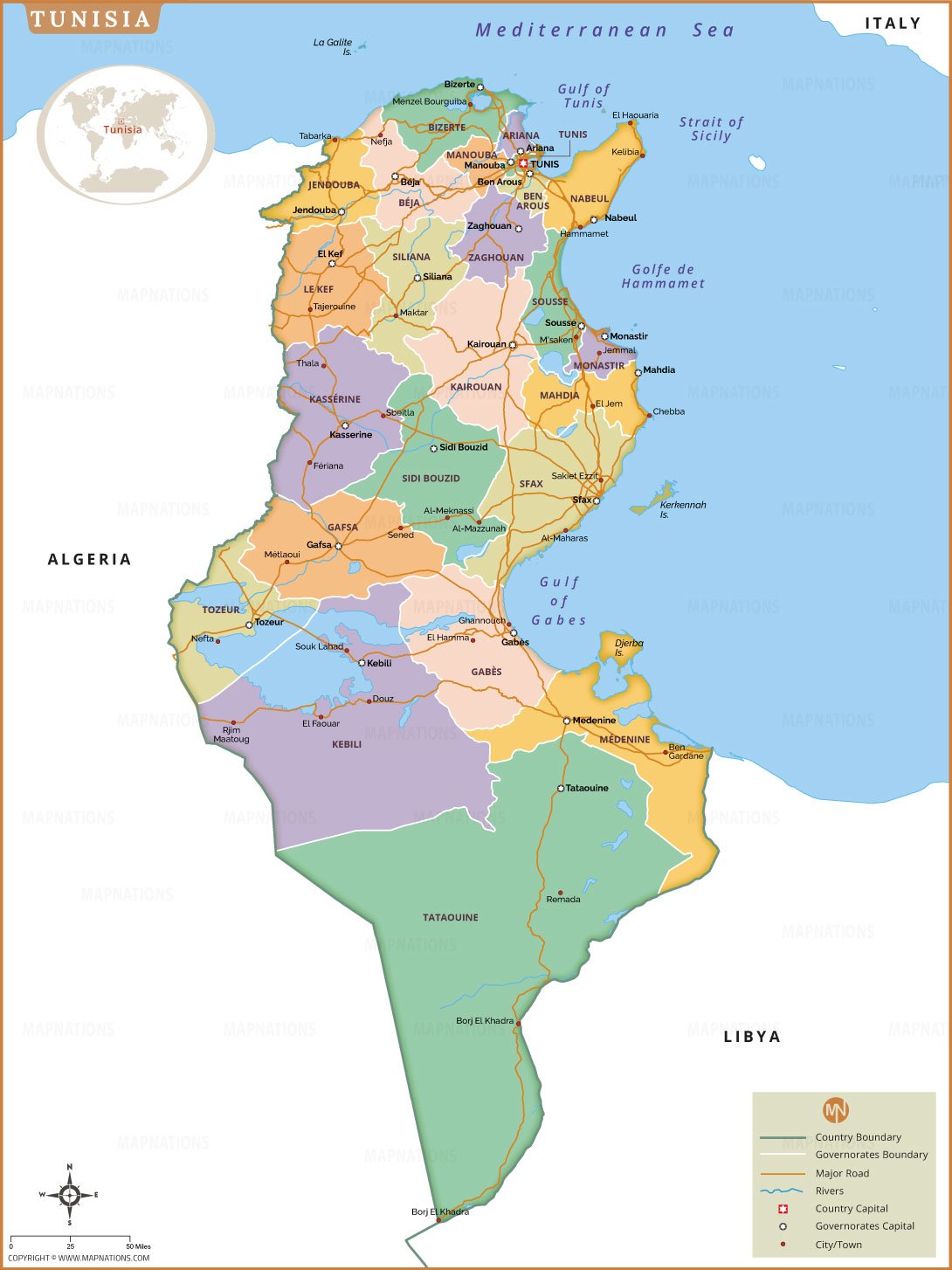 Map of Tunisia provides a comprehensive overview of the country's geography, administrative divisions and major cities. It highlights governorate boundaries, country borders, major roads and rivers, making it an essential resource for understanding Tunisia's regional makeup. The map also prominently highlights the capital Sanaa, as well as other important cities such as Aden, Taiz, Al Hudaydah, Al Mukalla and Ibb. Tunisia shares land borders with Saudi Arabia and Oman, while it is surrounded by the Red Sea, Arabian Sea and Gulf of Aden. This map also shows nearby countries, including Djibouti, Somalia, and Eritrea, providing a complete regional perspective. Ideal for students, travelers, researchers, and geography enthusiasts, this Tunisia map serves as an informative guide to the country's geography and political structure.