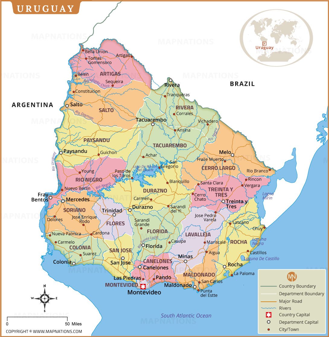 This detailed map of Uruguay highlights all major departments, department capitals, important cities, rivers, road networks, and international borders. It provides a clear geographic overview of Uruguay’s administrative divisions, including Montevideo, Canelones, Maldonado, Salto, and Rivera. The map also displays coastal regions along the South Atlantic Ocean, helping users understand Uruguay’s maritime location. Ideal for students, researchers, travelers, and educators, this map supports regional analysis and spatial planning. With clearly marked boundaries and transport routes, it serves as a reliable reference for academic studies, tourism planning, and general geographic awareness of Uruguay and its surrounding neighboring countries.