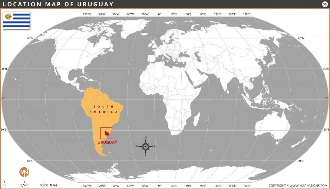 This location map of Uruguay highlights the country’s geographic position within South America and its placement on the world map. It clearly shows Uruguay’s proximity to Argentina, Brazil, and the South Atlantic Ocean. Useful for educational purposes, travel planning, and geographic studies, this map helps users quickly understand Uruguay’s continental location and global orientation. It serves as a valuable visual reference for students, researchers, and map enthusiasts.