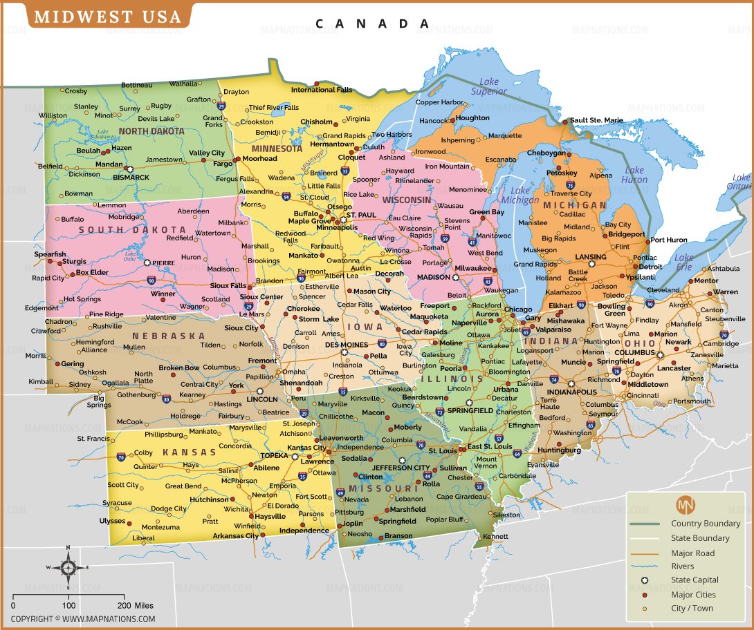 This detailed Midwest USA map provides a comprehensive view of one of America’s most important regions. It highlights state boundaries, capitals, and major cities across states such as Ohio, Michigan, Indiana, Illinois, Missouri, Iowa, Wisconsin, Minnesota, North Dakota, South Dakota, Nebraska, and Kansas. The map also features rivers, road networks, and geographic landmarks, making it a useful reference for travelers, students, and researchers. Key cities like Chicago, Detroit, Minneapolis, St. Louis, Columbus, and Indianapolis are clearly marked, along with state capitals.