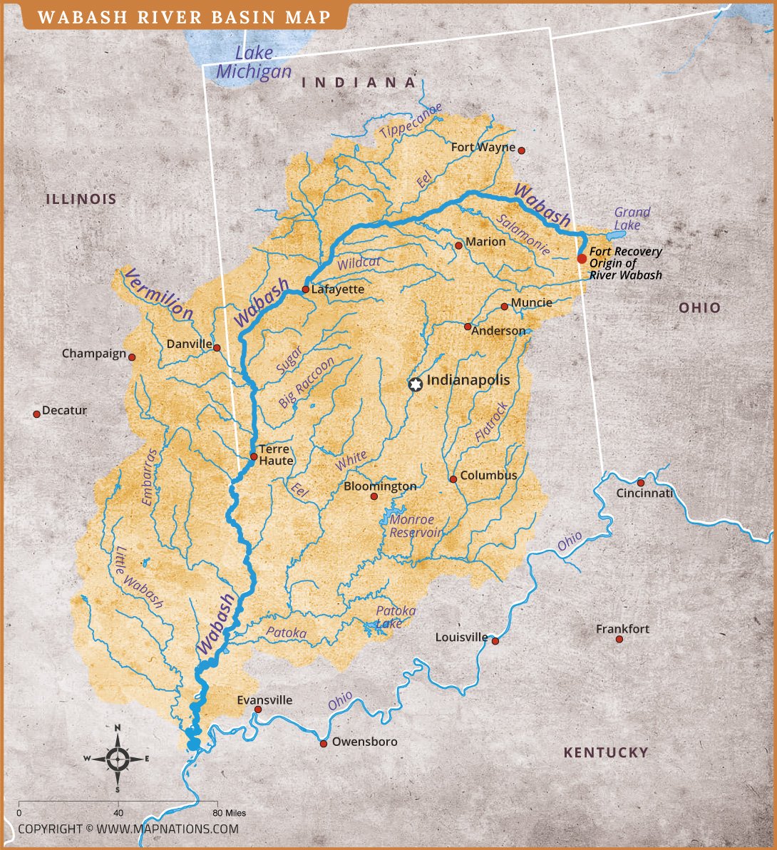 This detailed Wabash River Basin map helps viewers understand water flow patterns, tributary connections, and regional geography. The Wabash River originates near Fort Recovery, Ohio, and flows southwest across Indiana before joining the Ohio River near Evansville. The highlighted drainage area demonstrates how numerous streams feed into the main river channel. Surrounding states, nearby cities, and boundary outlines provide additional geographic context. Such maps are valuable for environmental studies, watershed management, educational purposes, and regional planning, offering a comprehensive overview of the Wabash River system and its influence across the Midwest.