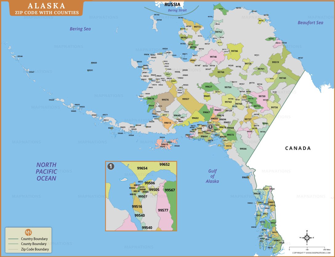 A detailed inset focuses on southern Alaska where ZIP code areas are more concentrated, improving readability. The map also shows Alaska’s proximity to Canada and surrounding waters. Clean labeling and color differentiation allow quick visual interpretation. This resource is helpful for mailing reference, logistics planning, geographic study, and general location awareness across Alaska’s vast landscape.