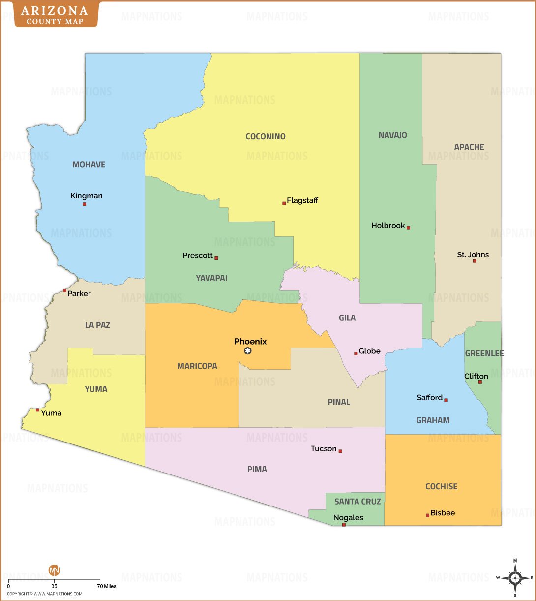 Arizona county map displaying the administrative divisions of the U.S. state of Arizona. It highlights all counties including Maricopa, Pima, Yavapai, Coconino, Mohave, Navajo, Apache, Yuma, La Paz, Pinal, Gila, Graham, Greenlee, Cochise, and Santa Cruz. Major cities such as Phoenix, Tucson, Flagstaff, Prescott, and Yuma are marked for geographic reference. The map is useful for education, travel, planning, and understanding Arizona’s regional county structure and spatial distribution across the state’s diverse desert and plateau.