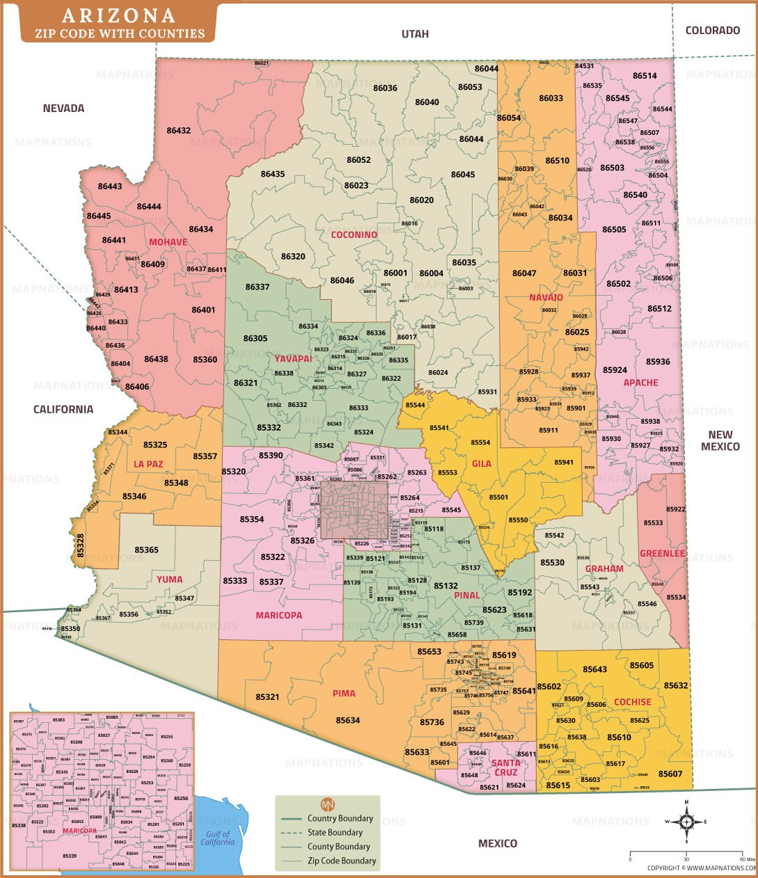 The map also displays neighboring states including California, Nevada, Utah, Colorado, and New Mexico, providing additional geographic context. County, state, and ZIP code boundaries are clearly marked for accurate interpretation. Southern regions such as Pima, Cochise, and Santa Cruz counties are shown with detailed postal coverage, while northern counties like Coconino and Navajo illustrate broader ZIP code zones. An inset highlights the Phoenix metropolitan area for more precise detail. This comprehensive Arizona postal map is ideal for businesses, researchers, travelers, and anyone needing a clear understanding of ZIP code distribution across the state.