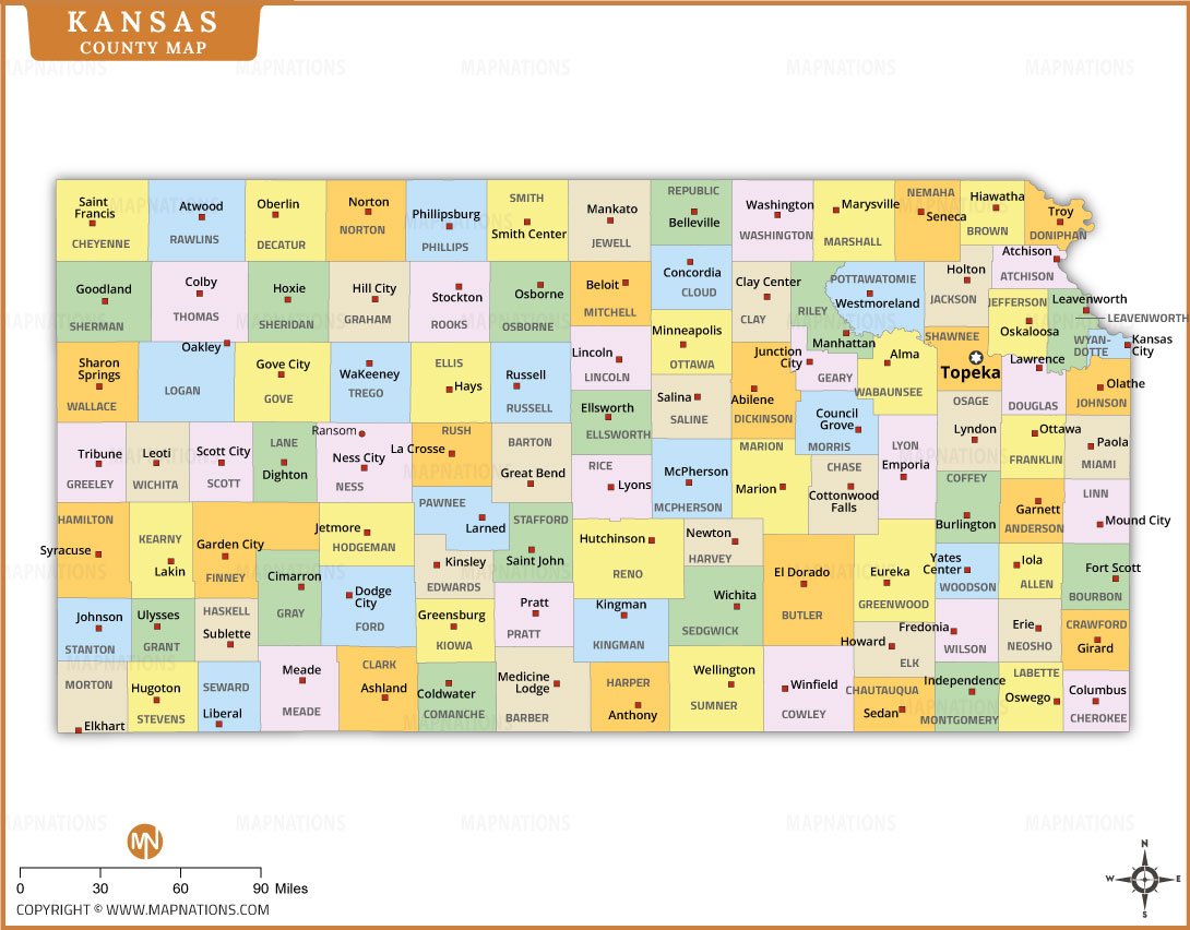 Kansas county map illustrating all 105 counties across the U.S. state of Kansas. The map highlights county boundaries and important cities such as Topeka, Wichita, Salina, Hutchinson, Dodge City, and Garden City. Each county is labeled for easy identification, helping users understand the administrative divisions of the state. This map is useful for education, research, travel planning, and geographic reference, offering a clear overview of Kansas’s regional county layout and distribution.