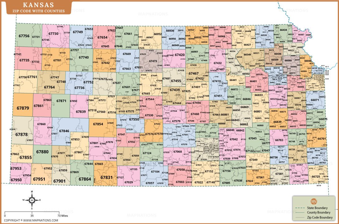 This Kansas ZIP code map with counties provides a detailed overview of postal regions across the state. Each ZIP code area is clearly labeled and organized within county boundaries, helping users quickly identify geographic divisions. The map displays major regions across western, central, and eastern Kansas, making it useful for understanding how ZIP codes are distributed statewide. Color-zip-coded counties enhance readability and allow easy differentiation between neighboring administrative areas.