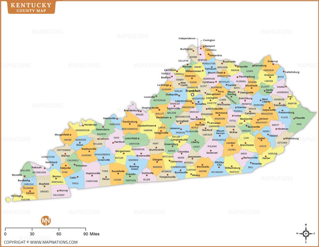 This Kentucky county map provides a detailed view of all 120 counties with clearly defined boundaries and soft color variations for easy distinction. Major cities such as Louisville, Lexington, Bowling Green, Owensboro, and Covington are clearly labeled. Counties including Jefferson, Fayette, Warren, Kenton, and Pike are prominently displayed for quick reference. The map includes a scale bar and compass for geographic accuracy. Ideal for educational use, administrative planning, and regional analysis, it offers a comprehensive overview of Kentucky’s political divisions.