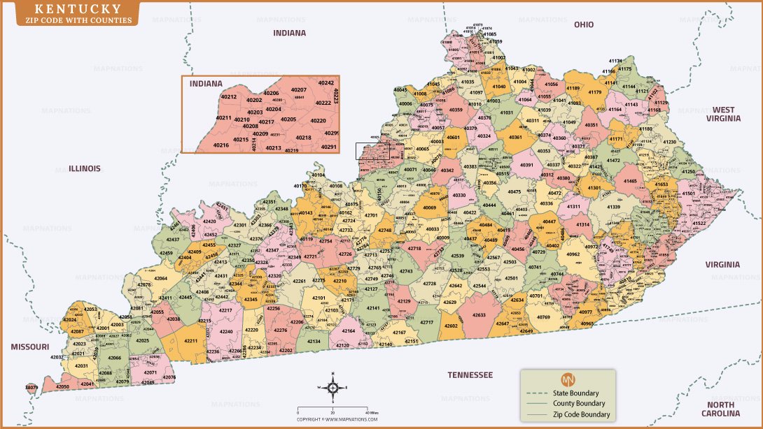 This Kentucky ZIP Code with Counties map illustrates detailed postal boundaries across the state, highlighting counties, neighboring states, and major regional divisions. Distinct color shading differentiates counties, while ZIP code labels provide precise geographic identification for each area. The map also shows bordering states including Indiana, Ohio, West Virginia, Virginia, Tennessee, Missouri, and Illinois, helping users understand Kentucky’s spatial context and regional connections.