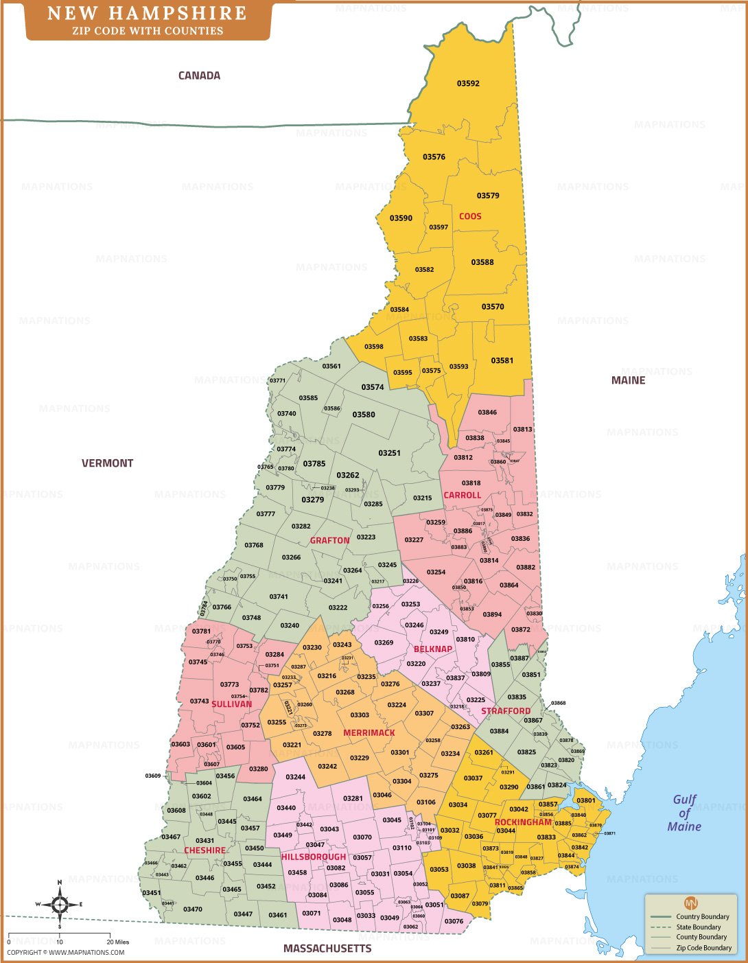 Color-coded counties make it easier to identify boundaries, while major ZIP code clusters highlight populated areas like Manchester, Nashua, Concord, and Portsmouth. This map is useful for logistics planning, demographic research, travel reference, and business analysis. It also helps students, marketers, and researchers quickly locate postal regions across New Hampshire with clear boundaries and organized labeling for easy navigation and understanding.