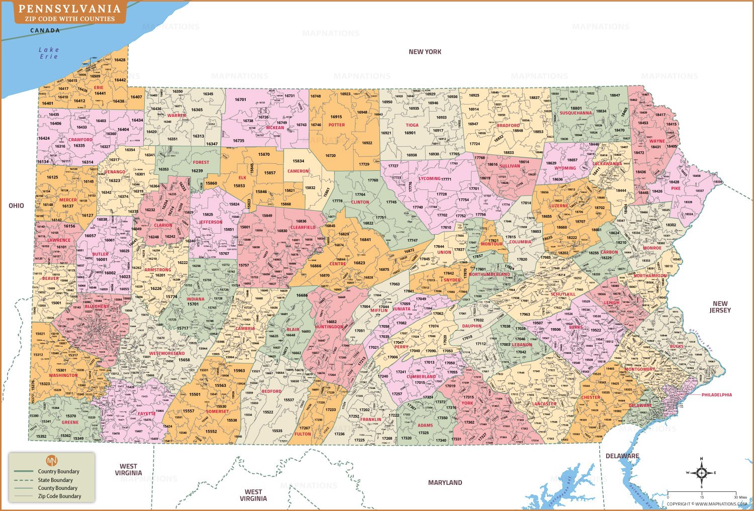 This Pennsylvania ZIP code map with counties highlights postal boundaries across the state, from Erie along Lake Erie to Philadelphia in the southeast. Each color-coded county clearly displays ZIP code areas, helping users identify regional divisions, nearby towns, and administrative limits. The map also outlines neighboring states including New York, Ohio, West Virginia, Maryland, and New Jersey for geographic context.