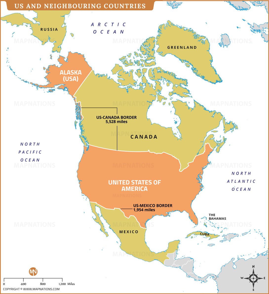 This map shows the United States and neighbouring countries, including Canada to the north and Mexico to the south. Alaska appears separately, highlighting its position near Russia. Surrounding oceans such as the North Pacific, North Atlantic, and Arctic are labeled to provide geographic context. The illustration emphasizes North America’s political boundaries and spatial relationships between major countries. Border lengths are indicated clearly.