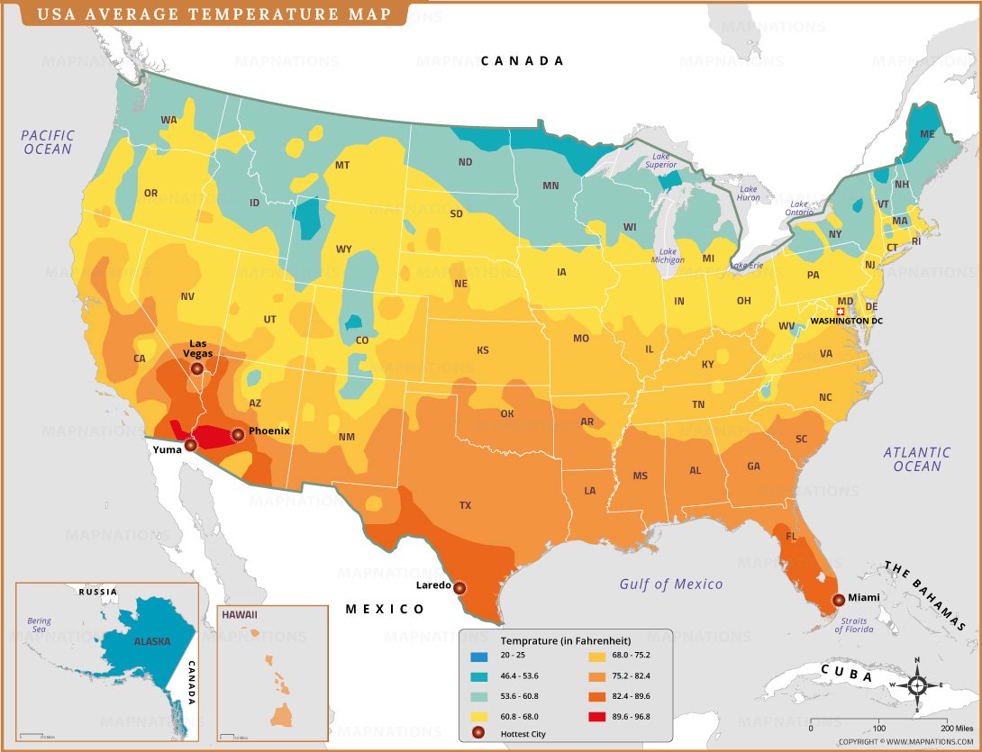 This USA average temperature map highlights regional climate variations, showing warmer southern states and cooler northern zones throughout the year. The Southwest, Gulf Coast, and parts of Florida display the highest temperatures, influenced by desert conditions and coastal humidity. In contrast, northern regions and mountainous areas remain significantly cooler, especially across the Midwest and Pacific Northwest, where elevation and latitude play key roles.