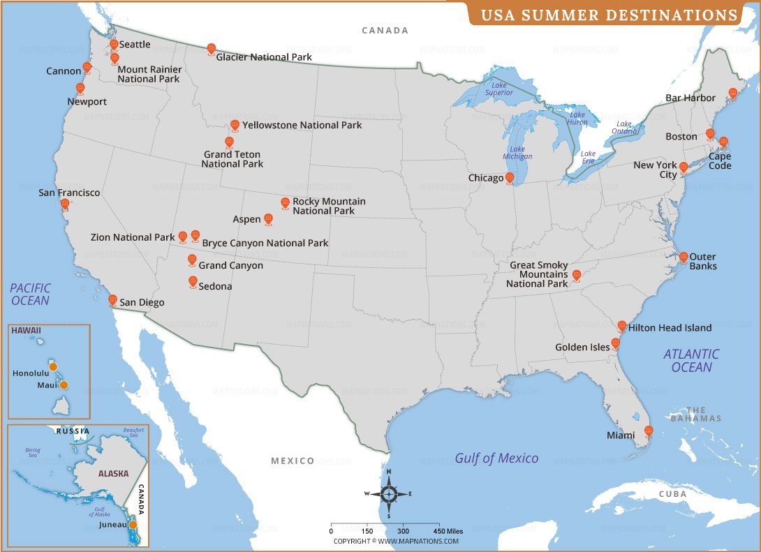 This USA summer destinations map showcases the most popular warm-season travel spots across the country. It highlights iconic national parks such as Yellowstone, Yosemite, Grand Canyon, and Glacier, along with vibrant cities including New York, Chicago, San Francisco, and Seattle. Coastal escapes like Miami, Cape Cod, Outer Banks, San Diego, and Hawaii are clearly marked. Designed for travelers and planners, the map offers a clear geographic overview of America’s best summer vacation destinations.