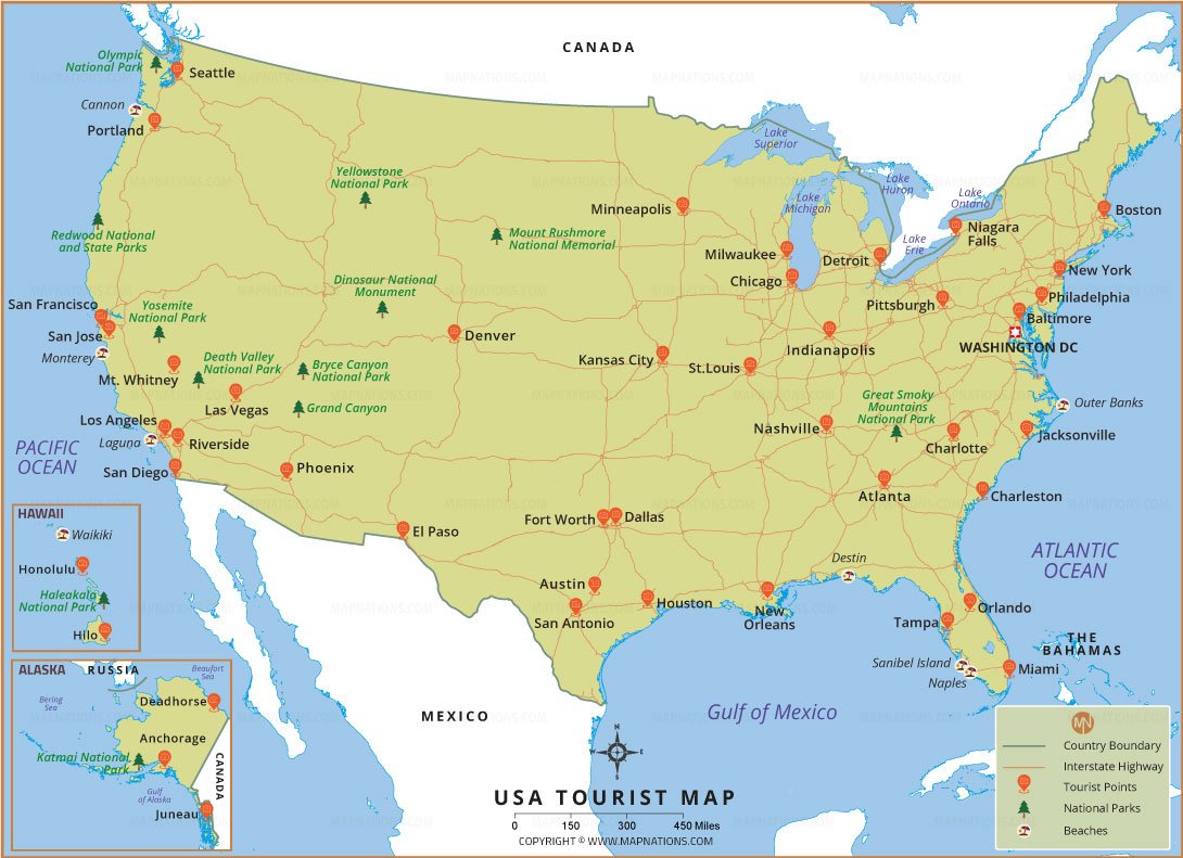 This USA Tourist Map provides a detailed visual guide to the country’s most popular travel destinations, including major cities, scenic national parks, iconic landmarks, and well-connected interstate highways. Travelers can easily locate attractions such as the Grand Canyon, Yellowstone, Yosemite, Niagara Falls, and the Great Smoky Mountains. The map also highlights famous urban centers like New York, Los Angeles, Chicago, and Miami, along with beach destinations across Florida, California, and Hawaii. Insets of Alaska and Hawaii offer additional clarity for exploring these unique regions. Ideal for trip planning, this map helps visitors navigate and discover America’s diverse and captivating tourist experiences.