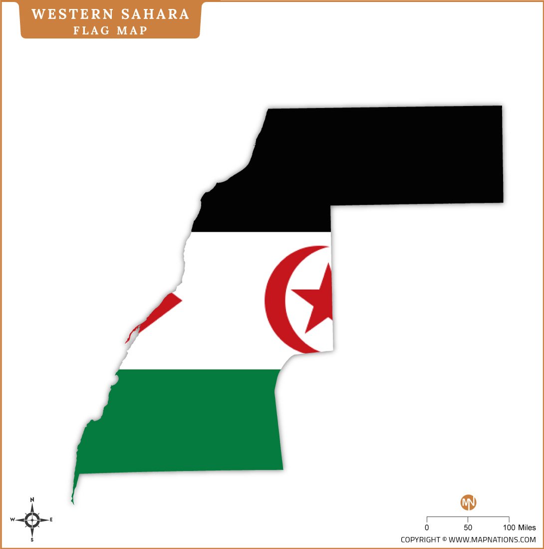 This flag map of Western Sahara shows the territorial outline filled with the Sahrawi Arab Democratic Republic flag. It visually represents identity, political symbolism, and geography in a simple, clean design. The map is ideal for educational use, infographics, articles, presentations, and school projects. By combining national colors with geographic shape, it helps viewers quickly recognize Western Sahara and understand its distinct status within northwest Africa clearly and effectively for global audiences and academic reference.