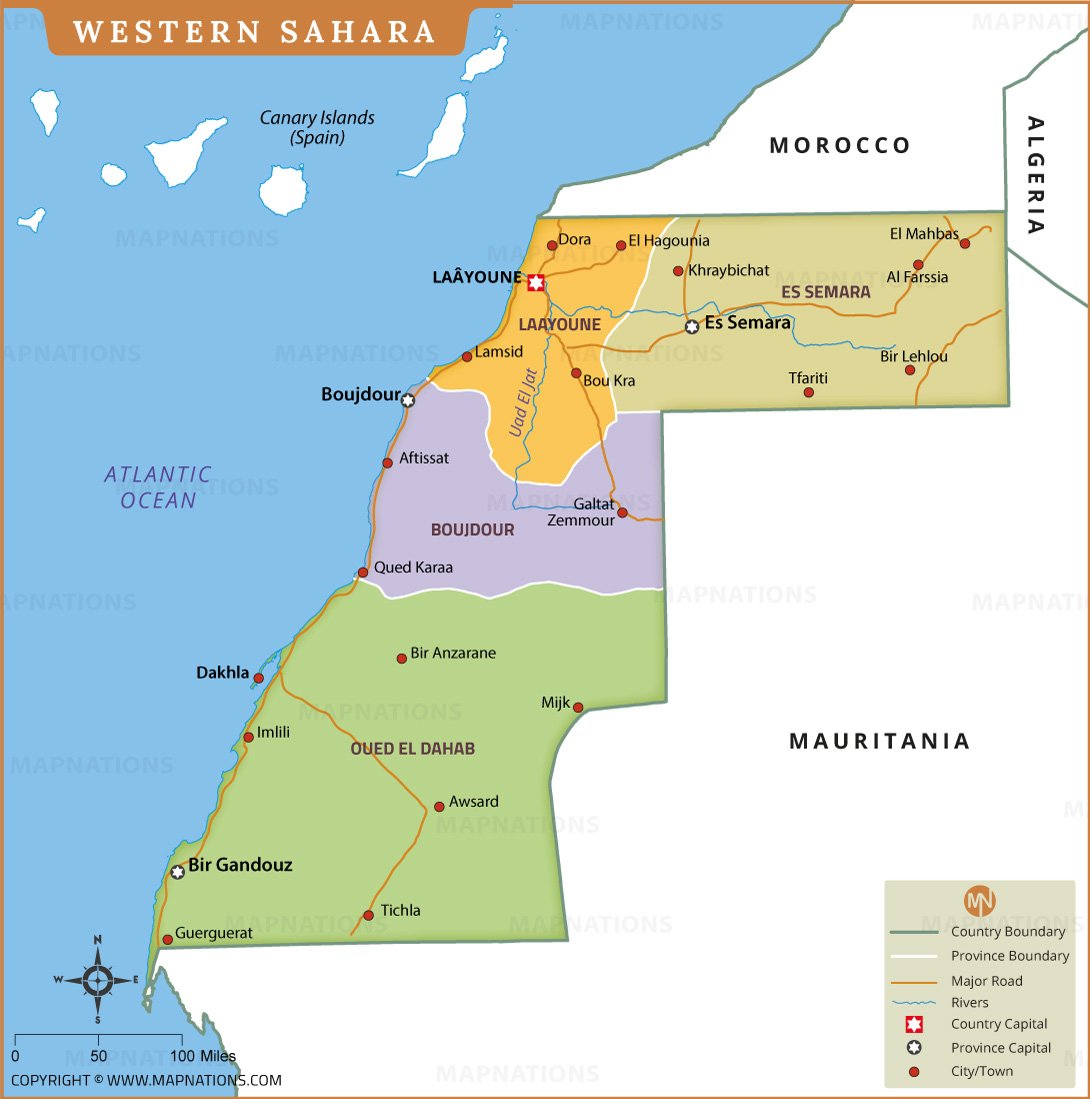 This Western Sahara map presents a clear political and geographic overview of the disputed territory in northwest Africa. It highlights provincial boundaries, major towns such as Laayoune, Dakhla, and Smara, and important road connections. Neighboring countries including Morocco, Algeria, and Mauritania are clearly marked, along with the Atlantic Ocean coastline and Canary Islands reference. The map is useful for education, research, travel planning, and general awareness, helping readers understand regional administration, settlement distribution, and spatial relationships across Western Sahara through a clean, easy to read cartographic design, suited for presentations, classrooms, websites, reports, and visual learning needs worldwide today effectively.