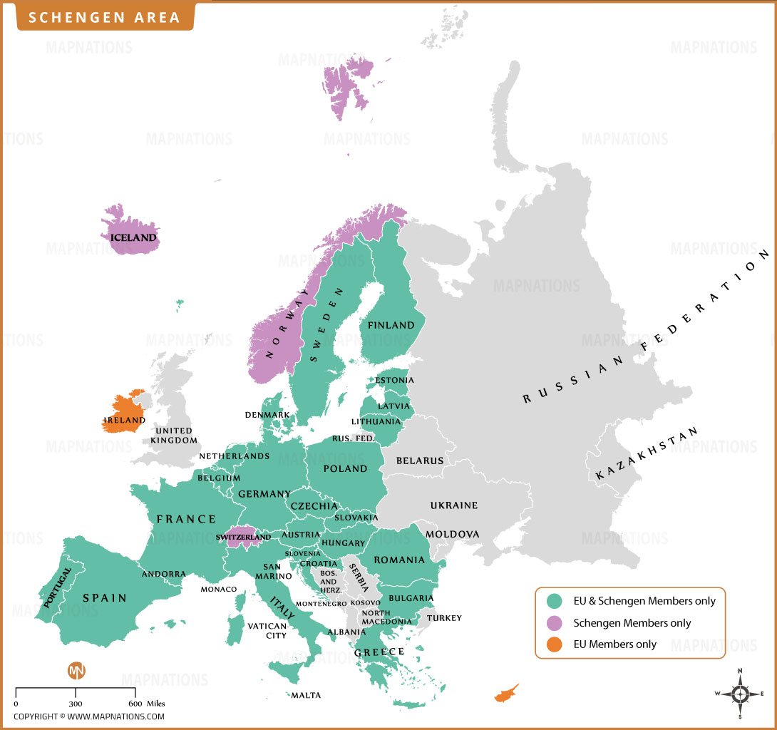 This Schengen Area map illustrates European countries participating in the Schengen Agreement with clear color distinctions. EU and Schengen members are marked separately from Schengen-only and EU-only nations, providing a comprehensive regional overview. Countries such as France, Germany, Spain, Italy, and Poland are highlighted, along with non-EU Schengen members like Norway, Switzerland, and Iceland. Ireland and select EU states outside Schengen are also distinctly represented. The map includes surrounding nations like the United Kingdom, Ukraine, Turkey, and Russia for geographical context. Clean labeling, defined borders, and an organized legend make this map ideal for educational, travel, and reference purposes.