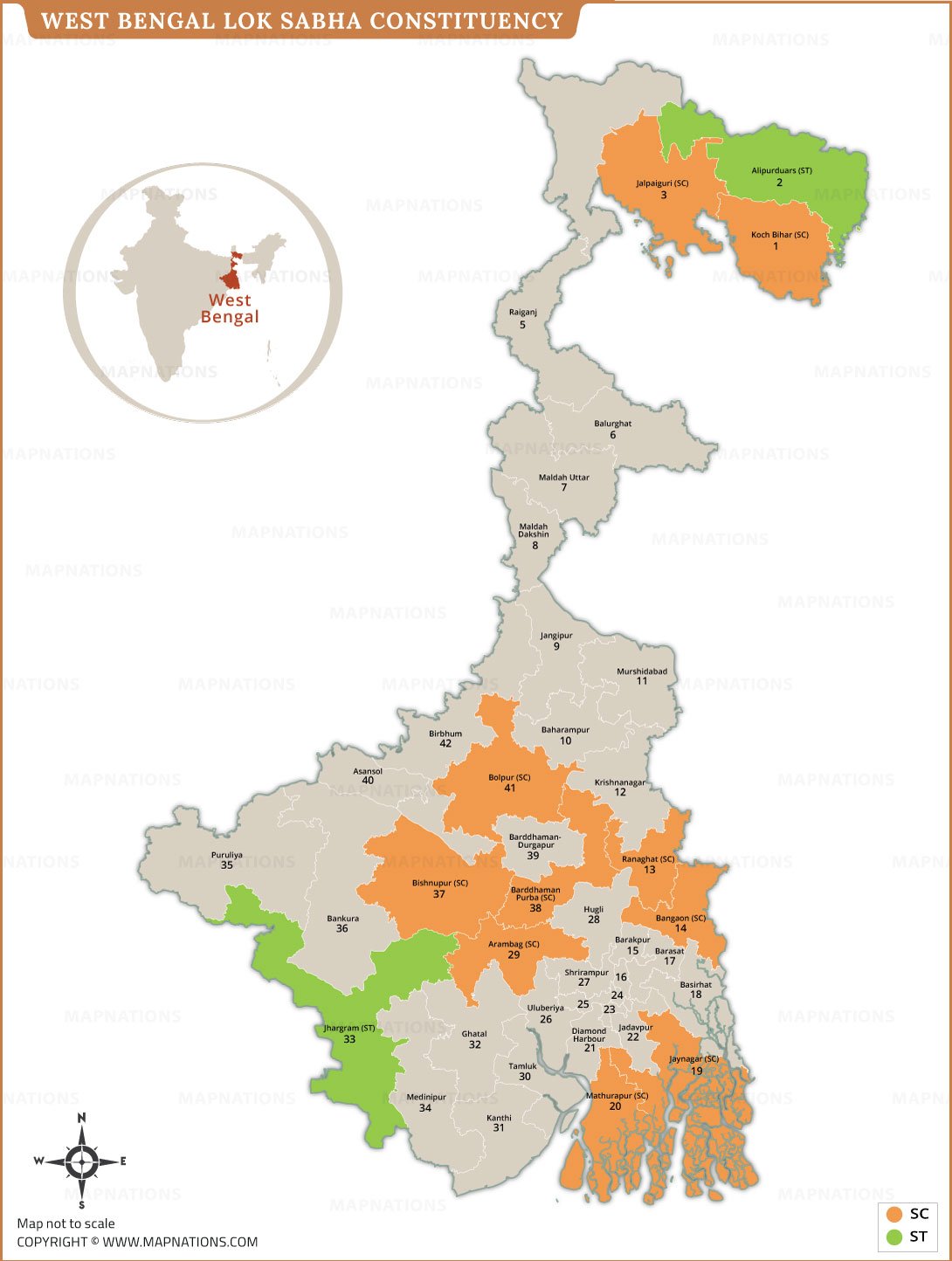 This West Bengal Lok Sabha Constituency map clearly displays all parliamentary constituencies across the state with distinct boundaries and seat numbers. It highlights general, Scheduled Caste (SC), and Scheduled Tribe (ST) reserved constituencies for easy identification. Covering regions from North Bengal to the Sundarbans, the map is ideal for students, researchers, journalists, and election analysts seeking a visual understanding of West Bengal’s parliamentary structure and electoral geography.
