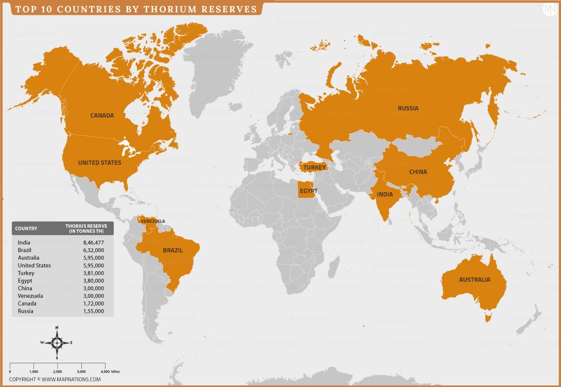 This map highlights the top 10 countries by thorium reserves, showing their global distribution and relative importance in future nuclear energy development. India leads with the largest thorium resources, followed by Brazil and Australia, which also hold significant deposits. The United States and Turkey are other major contributors, while Egypt and China maintain moderate reserves. Venezuela, Canada, and Russia complete the list, each possessing notable thorium potential.