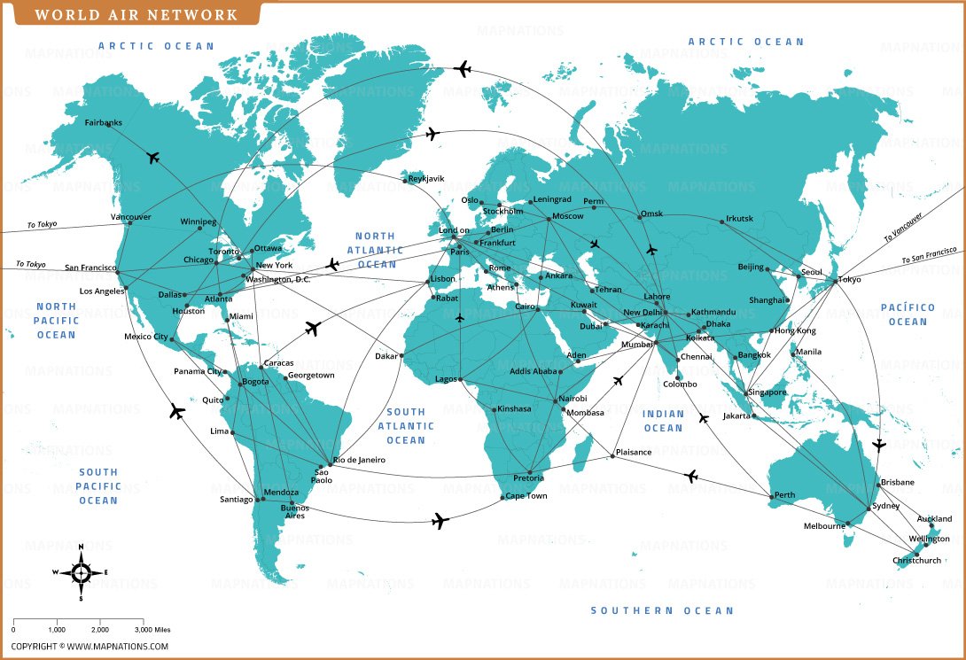 This World Air Network Map illustrates global aviation connectivity by displaying major flight routes linking key cities across continents. Curved air paths connect North America, Europe, Asia, Africa, South America, and Australia, highlighting international travel corridors. Important aviation hubs such as New York, London, Dubai, Singapore, Tokyo, and Sydney serve as central nodes. The map provides a clear overview of long-haul intercontinental routes and regional connections, helping users understand how global air transport networks operate efficiently worldwide.