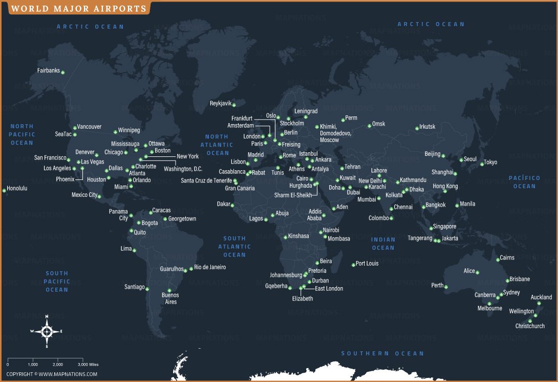 This World Major Airports Map displays the most important international aviation hubs across every continent, highlighting global air connectivity. Major airports in North America, Europe, Asia, Africa, South America, and Australia are clearly marked to show their strategic locations. Cities such as New York, London, Dubai, Singapore, Tokyo, and Sydney appear as key transit points. The map provides a quick visual understanding of how global air routes connect major population and economic centers worldwide.