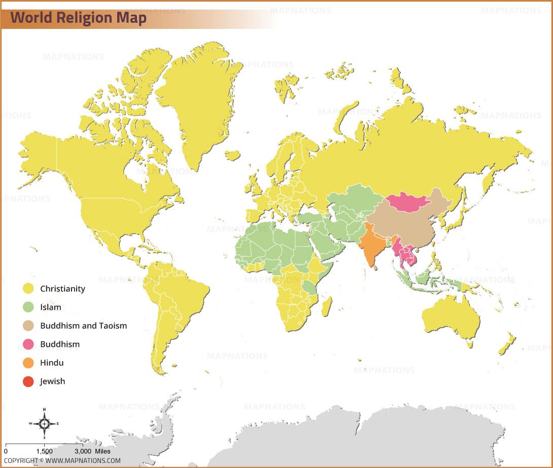This world religion map presents the global distribution of major religious traditions across continents and countries. Christianity dominates much of the Americas, Europe, and Australia, while Islam is prevalent across North Africa, the Middle East, and parts of Asia. Hinduism is concentrated mainly in India, Buddhism in East and Southeast Asia, and Judaism primarily in Israel. The map offers a clear visual overview of religious patterns worldwide.